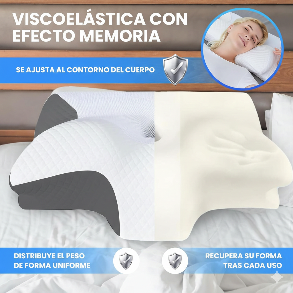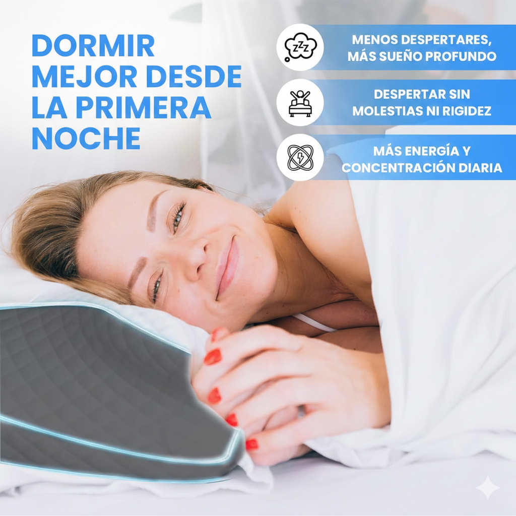 Corrige tu postura mientras duermes y elimina la tensión acumulada en el cuello y los hombros con nuestra almohada cervical ergonómica. Su diseño avanzado alinea tu columna de forma natural, liberando los puntos de presión para que despiertes sin rigidez, con total energía y libre de molestias cada mañana.